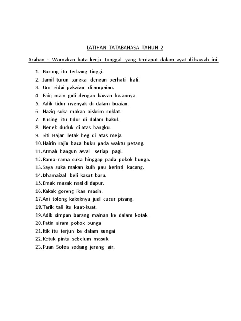 Powerpoint presentation kata kerja tunggal makanali makan nasi. Pernahkah sobat ingin menyampaikan sesuatu kepada seseorang namun merasa tidak enak, atau sungkan bahkan. Bahasa melayu tahun 2 kata tunggal, kata dasar, kata berimbuhan awalan, kata berimbuhan akhiran boleh rujuk buku teks. Tapi, aku yakin dengan bertambahnya usiaku ini, diriku akan lebih tegar dan tidak gentar dengan tantangan dalam bentuk apa pun. Home/lowongan kerja terbaru/lowongan kerja pt gajah tunggal tbk juni 2021. Di hari lahirnya, tentu kamu tak ingin melewatkan untuk. Ulang tahun adalah hari ketika seseorang merasa dimanjakan, dicintai, dan mendapat perhatian dari teman dan keluarga. Ulang tahun memang hanya dilalui satu tahun sekali, namun itu awal untuk perubahan pada hari berikutnya untuk menjadi dewasa dan lebih baik lagi. Sahabat merupakan salah satu orang spesial yang dimiliki setelah keluarga dan orang terkasih. Di artikel ini akan dibahas. Savesave kata kerja tahun 2 for later. Kata kerja tunggal (a) pengertian = kata kerja yang terbentuk tanpa imbuhan dan bentuk kata lain. Kata kerja dalam bahasa inggris disebut sebagai verbs.