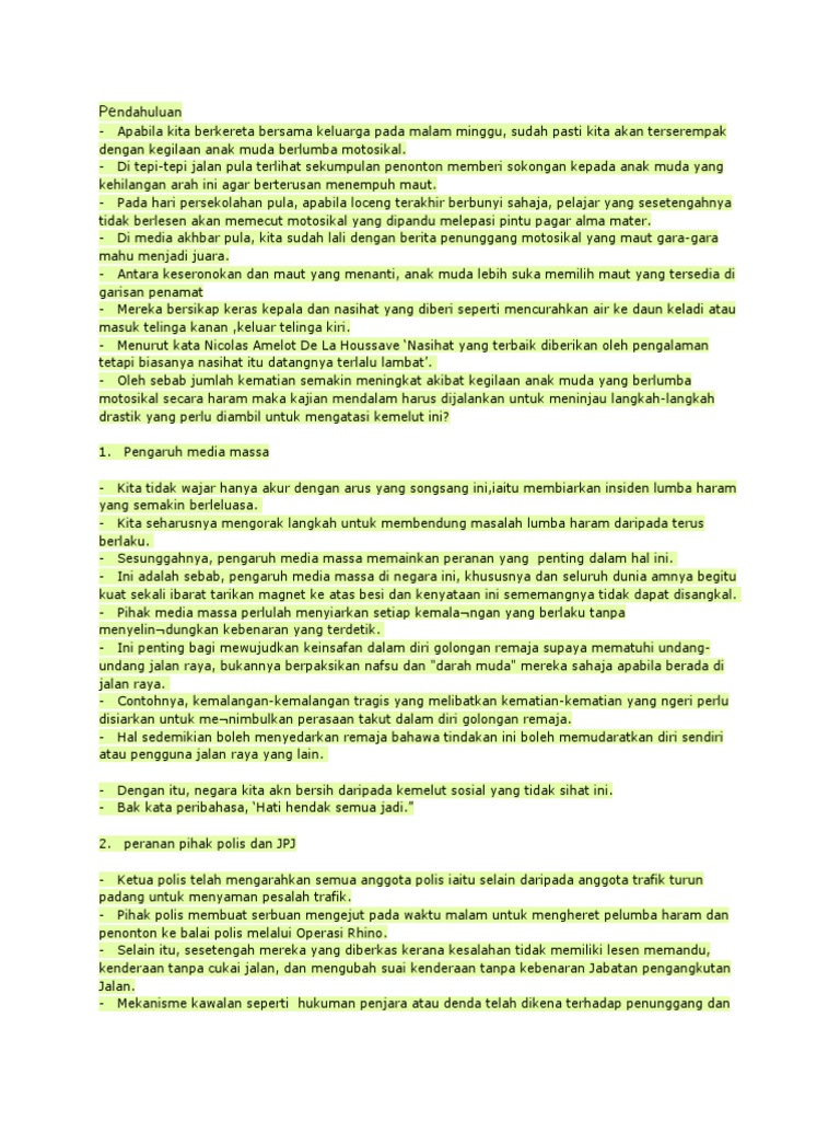 August 23, 2008 at 2:21 pm (uncategorized) penglibatan remaja dalam perlumbaan motosikal secara haram membimbangkan banyak pihak. Dalam mendidik anak, ibu bapa harus bijak dan berupaya untuk mengawasi tingkah laku anak mereka dengan berkesan terutama anak yang sudah mencapai umur remaja. Langkah langkah mengatasi gejala lumba haram. Pembabitan remaja dalam kegiatan lumba haram bukanlah satu isu. See full list on ipendidikan.my