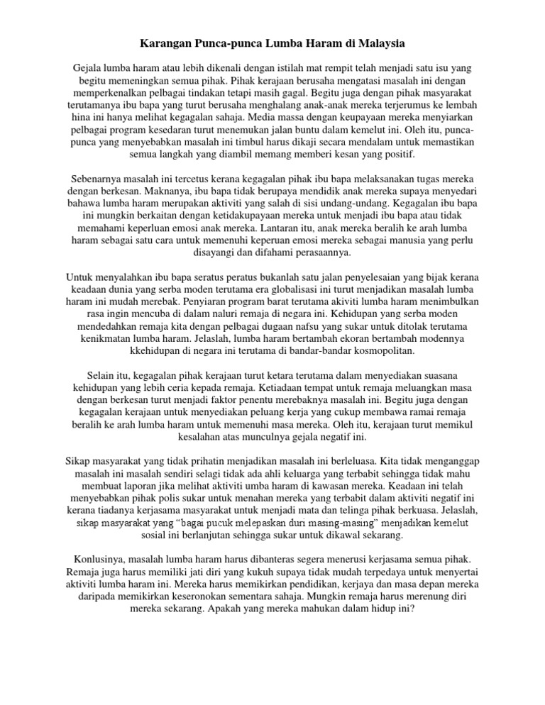 Sehingga hari ini, polemik ini masih lagi tidak dibendung dan tiada tindakan yang memberikan impak sebagai penyelesaian kepada masalah ini. Ibarat melepaskan batuk di tangga. Kebanyakan golongan remaja yang berfikiran cetek tanpa berfikiran panjang mudah terjebak dalam kegiatan yang tidak sihat ini. For more information and source, see on this link : Secara tuntasnya, keluarga memainkan peranan yang penting dalam mengatasi masalah penglibatan golongan remaja dalam perlumbaan haram. Aug 23, 2008 · karangan mengatasi masalah pembabitan remaja dalam lumba haram. Oleh yang demikian, tauladan yang baik hendaklah bermula dari ruma. Mereka telah berani untuk menipu ibu dan bapa atau ahli keluarga yang lain tentang perihal dan aktiviti yang mereka lakukan di waktu senggang. Kegiatan lumba haram semakin serius sejak kebelakangan ini. Industri sukan permotoran di negara kita juga mempunyai peluang yang banyak sehingga melahirkan pelum bertaraf dunia seperti hafizh syahrin dan khairul idham pawi. See full list on ipendidikan.my Bagaimana untuk mengatasi masalah lumba haram dalam kalangan remaja? Misalnya, ibu dan bapa boleh menggalakkan golongan remaja ini terlibat secara aktif dalam bidang sukan.
