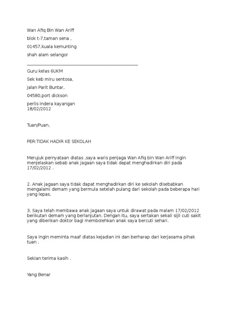 Related : Surat Tidak Hadir Ke Sekolah Kerana Sakit / Doc Surat Tidak Hadir Zulfikar Dahlan Academia Edu / Contoh surat rasmi tidak hadir ke sekolah kerana cuti sakit..